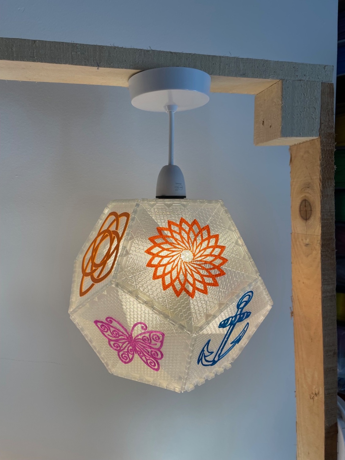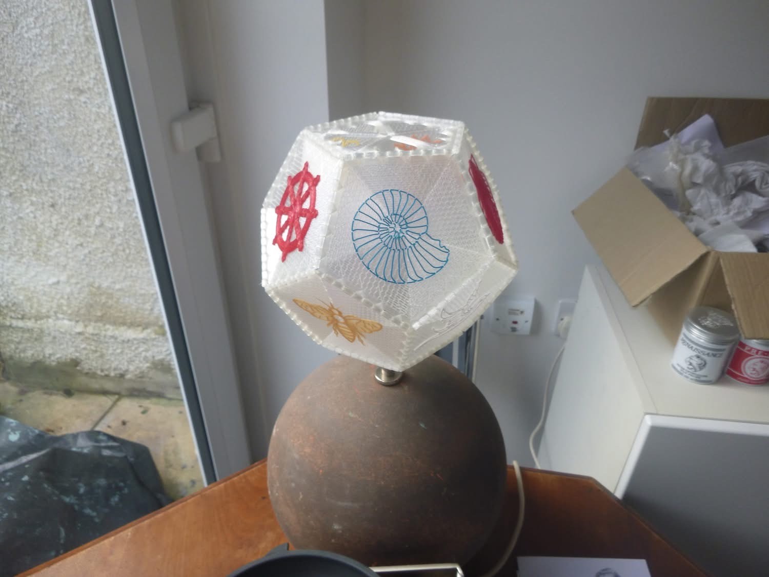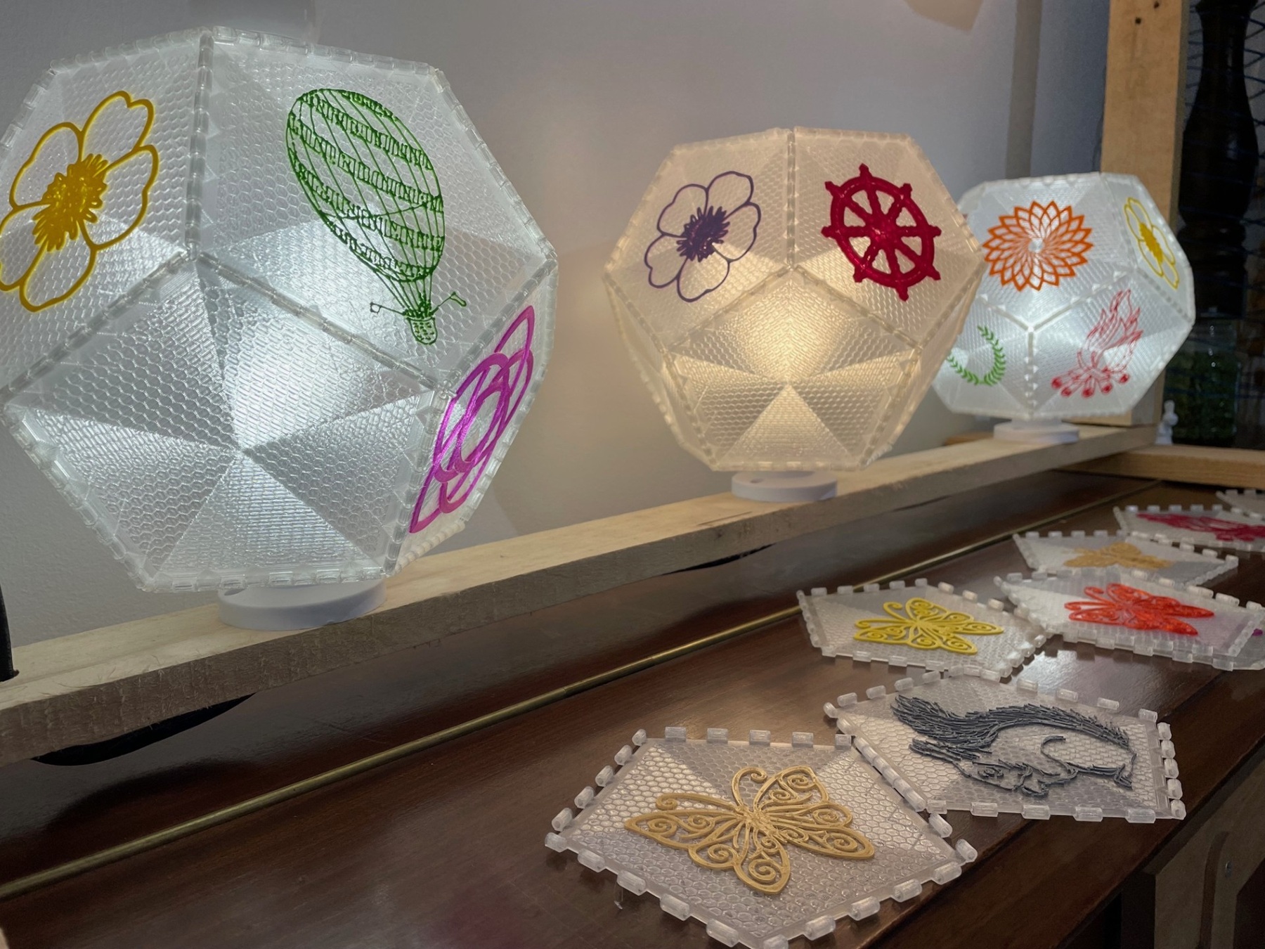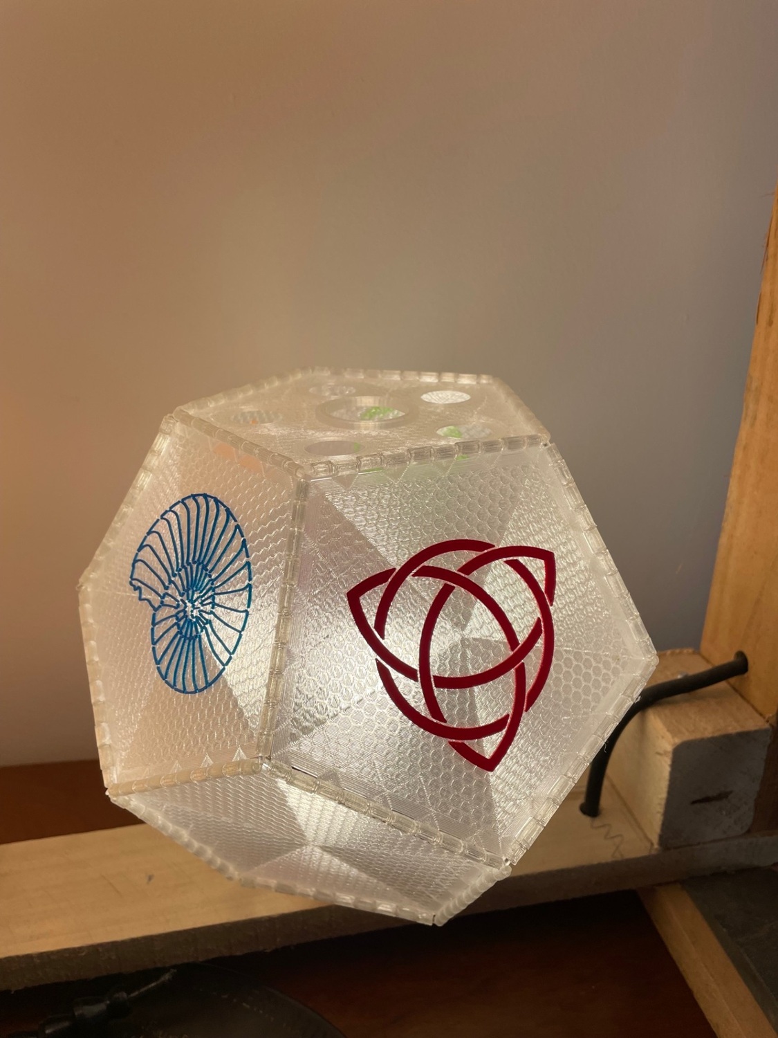 Each face of the polyhedron is 3D-printed separately, using transparent filament. This creates a fine pattern which may be honeycomb, spiral, triangles, squares, stars or others. On each face you can have a coloured silhouette, in different colours. The silhouettes are mostly designs freely available on the internet. The Celtic knots are my own design, and others may follow.