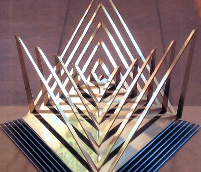 REFLEXION is built from a square sheet by making cuts to form the concentric strips that project outwards and upwards. Folds then raise the projecting strips and form the pyramidal base from double-width strips. The innermost strips are cut square, and consequently have parallel edges. The outer strips taper towards the top to give an effect of fading away from the centre. The extra material released by the tapering is used to provide an overlap along the edges of the pyramidal base. This overlap is used to provide an interlock along the lower edges of the base. The interlock provides complete rigidity for the structure without the use of any brazing, solder or adhesive.